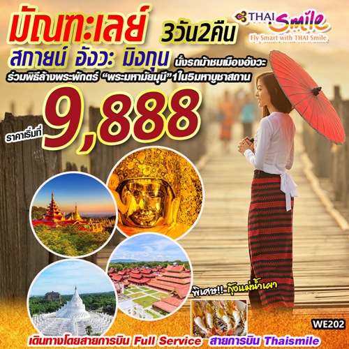 มาลินี พ้นภัยพาลสายการบินไทยสมายล์แอร์เวย์ เดินทาง ม.ค.- มี.ค.63 ราคาเริ่ม 9,888 บาท นั่งรถม้าชมเมืองอังวะ ผ่านชมสะพานไม้อูเบ็ง สะพานไม้ที่ยาวที่สุดในโลก ร่วมพิธีล้างพระพักตร์ พระมหามัยมุนี 1ใน5มหาบูชาสถาน ล่องเรือชมวิถีชีวิตหมู่บ้านมิงกุน ชมเจดีย์มิงกุนและระฆังมิงกน