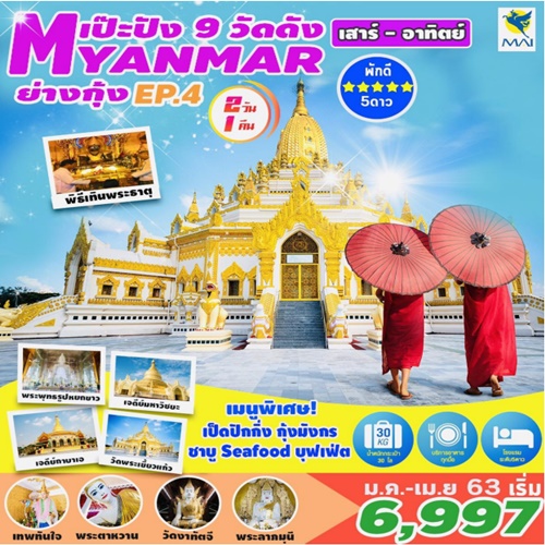 มาลินี พ้นภัยพาลสายการบิน Myanmar Airways เดินทาง ม.ค.- เม.ย.63 ราคาเริ่ม 6,997 บาท ย่างกุ้ง พระลาภมุนี พระเขี้ยวแก้ว เจดีย์มหาวิชยะ พระมหาเจดีย์ชเวดากอง เจดีย์โบตาทาวน์ (เทพทันใจ เทพกระซิบ) พระพุทธไสยาสน์เจาทัตยี เจดีย์กาบาเอ ตลาดสก็อต