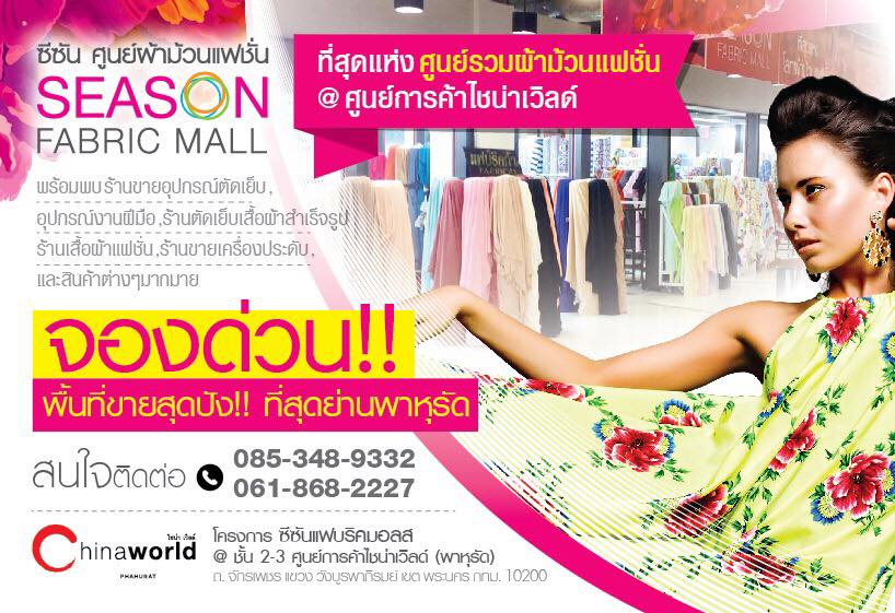 เปิดโอกาสให้คุณลูกค้าที่กำลังมองหาทำเลค้าขาย พลาดไม่ได้ค๊า กับ "Season Fabric Mall" . ศูนย์รวมผ้าม้วนใหญ่ที่สุดในกรุงเทพ จำหน่ายสินค้าประเภท ผ้าม้วน อุปกรณ์ตัดเย็บ จองด่วนวันนี้!!! พบกับโปรโมชั่นสุดพิเศษ . สนใจติดต่อคุณแนน 085-3489332 หรือ 061-8682227