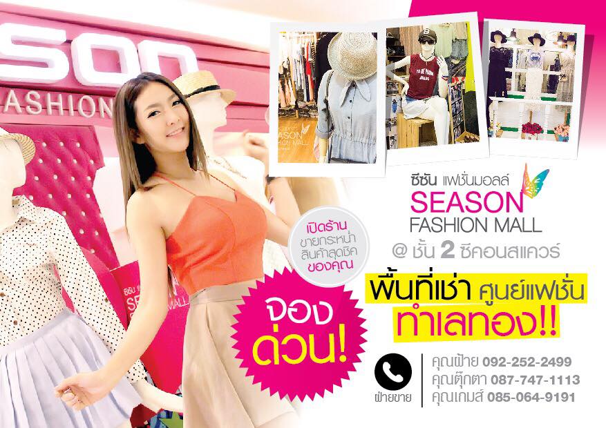 เปิดโอกาสให้คุณลูกค้าที่กำลังมองหาทำเลค้าขาย พลาดไม่ได้ กับ "ซีซันแฟชั่นมอลล์" . ศูนย์รวมแฟชั่นย่านศรีนครินทร์ จองด่วนวันนี้!!! พบกับโปรโมชั่นสุดพิเศษ มีจำนวนจำกัด เบอร์ติดต่อ 087-747-1113 คุณตุ๊กตา 092-252-2499 คุณฝ้าย 092-482-9888 คุณเกมส์